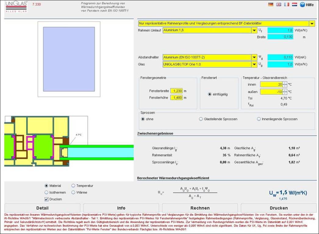 - Berechnung des Uw-Wertes von Fenstern nach EN ISO 10077-1 in Abhängigkeit von der Fenstergröße Uf, Ug, Psi und Rahmenbreite.